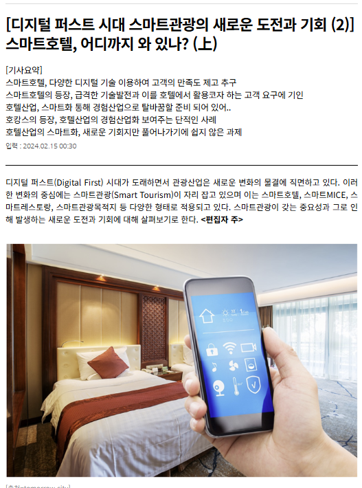 [News2day 기고문] [디지털 퍼스트 시대 스마트관광의 새로운 도전과 기회 (2)] 스마트호텔, 어디까지 와 있나? (上) 페이지 정보 작성자 STRC 댓글 0건 조회 244회 작성일 2025-07-22 10:34 본문 기고문 보기: https://www.news2day.co.kr/article/20240214500135# 목록 이전글[News2day 기고문] [디지털 퍼스트 시대 스마트관광의 새로운 도전과 기회 (3)] 스마트호텔, 어디까지 와 있나? (中) 25.07.22 다음글[News2day 기고문] [디지털 퍼스트 시대 스마트관광의 새로운 도전과 기회 (1)] 스마트관광으로 도약의 기회를! 25.07.22 댓글목록 댓글목록 등록된 댓글이 없습니다.