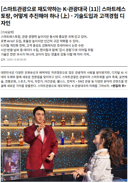 [News2day 기고문] [스마트관광으로 재도약하는 K-관광대국 (11)] 스마트레스토랑, 어떻게 추진해야 하나 (上) - 기술도입과 고객경험 디자인 페이지 정보 작성자 STRC 댓글 0건 조회 70회 작성일 2025-11-14 12:16 본문 기고문 보기: https://m.news2day.co.kr/article/20251007500028# 목록 이전글[News2day 기고문] [스마트관광으로 재도약하는 K-관광대국 (12)] 스마트레스토랑, 어떻게 추진해야 하나 (中) - 사회적 함의와 노동의 재구성 25.11.14 다음글[News2day 기고문] [스마트관광으로 재도약하는 K-관광대국 (10)] 스마트레스토랑, 어디까지 왔나? (下) 25.09.11 댓글목록 댓글목록 등록된 댓글이 없습니다.