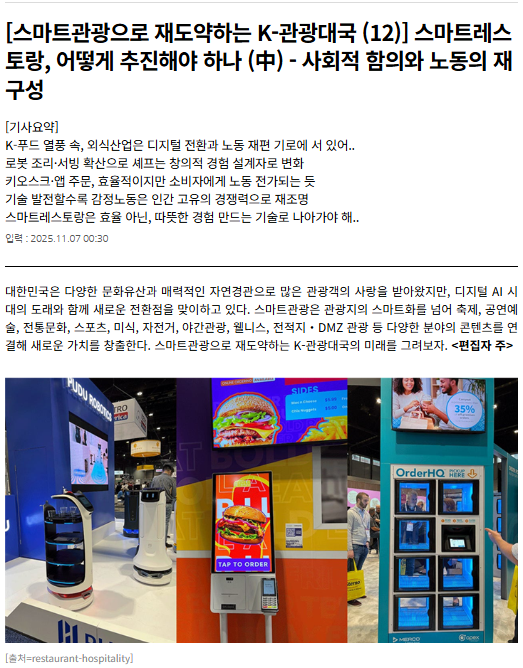 [News2day 기고문] [스마트관광으로 재도약하는 K-관광대국 (12)] 스마트레스토랑, 어떻게 추진해야 하나 (中) - 사회적 함의와 노동의 재구성 페이지 정보 작성자 STRC 댓글 0건 조회 71회 작성일 2025-11-14 12:17 본문 기고문 보기: https://m.news2day.co.kr/article/20251106500245 목록 다음글[News2day 기고문] [스마트관광으로 재도약하는 K-관광대국 (11)] 스마트레스토랑, 어떻게 추진해야 하나 (上) - 기술도입과 고객경험 디자인 25.11.14 댓글목록 댓글목록 등록된 댓글이 없습니다.